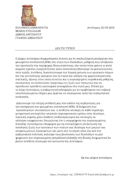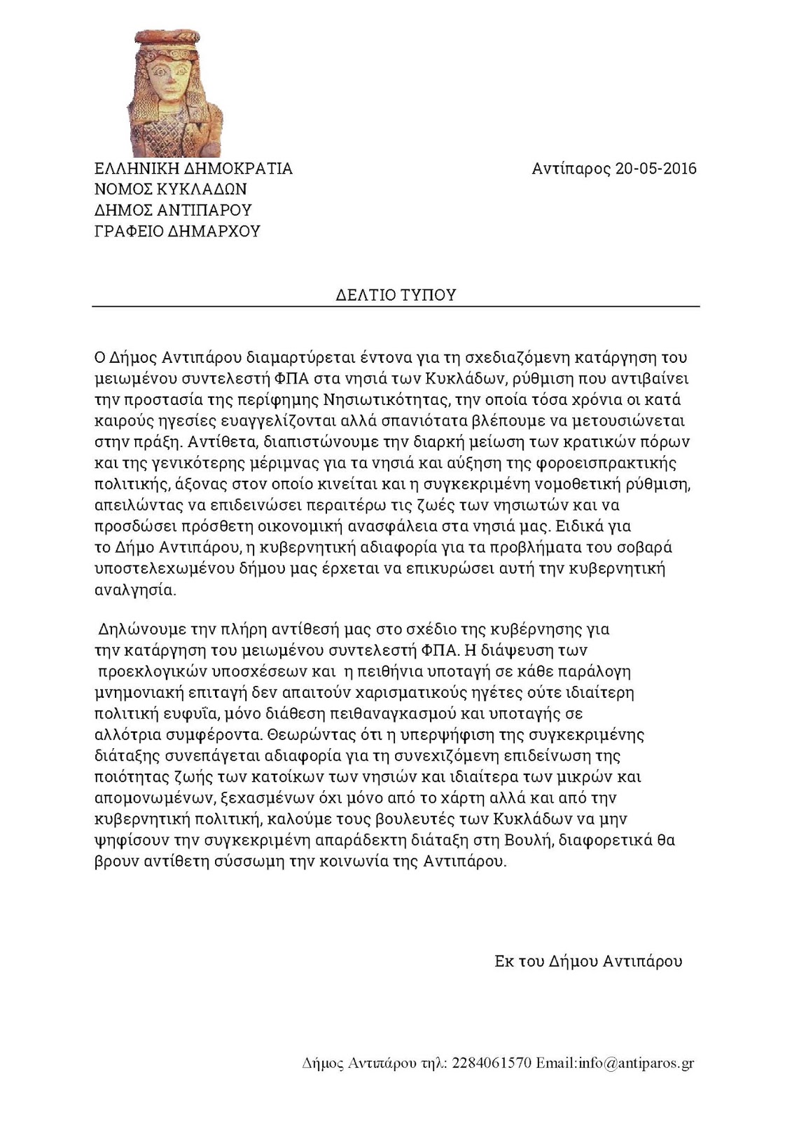 ΔΕΛΤΙΟ ΤΥΠΟΥ – Ο ΔΗΜΟΣ ΑΝΤΙΠΑΡΟΥ ΔΙΑΜΑΡΤΥΡΕΤΑΙ ΕΝΤΟΝΑ ΓΙΑ ΤΗ ΣΧΕΔΙΑΖΟΜΕΝΗ ΚΑΤΑΡΓΗΣΗ ΤΟΥ ΜΕΙΩΜΕΝΟΥ ΣΥΝΤΕΛΕΣΤΗ ΦΠΑ