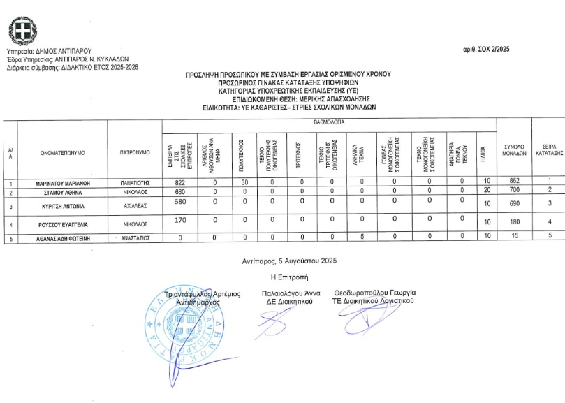 ΠΡΟΣΩΡΙΝΟΣ ΠΙΝΑΚΑΣ ΚΑΤΑΤΑΞΗΣ ΥΠΟΨΗΦΙΩΝ ΚΑΘΑΡΙΣΤΕΣ-ΣΤΡΙΕΣ ΣΧΟΛΙΚΩΝ ΜΟΝΑΔΩΝ