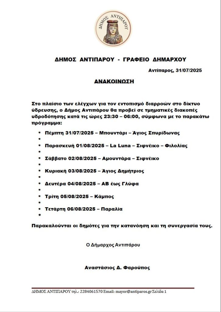 Στο πλαίσιο των ελέγχων για τον εντοπισμό διαρροών στο δίκτυο ύδρευσης, ο Δήμος Αντιπάρου θα προβεί σε τμηματικές διακοπές υδροδότησης κατά τις ώρες 23:30 – 06:00
